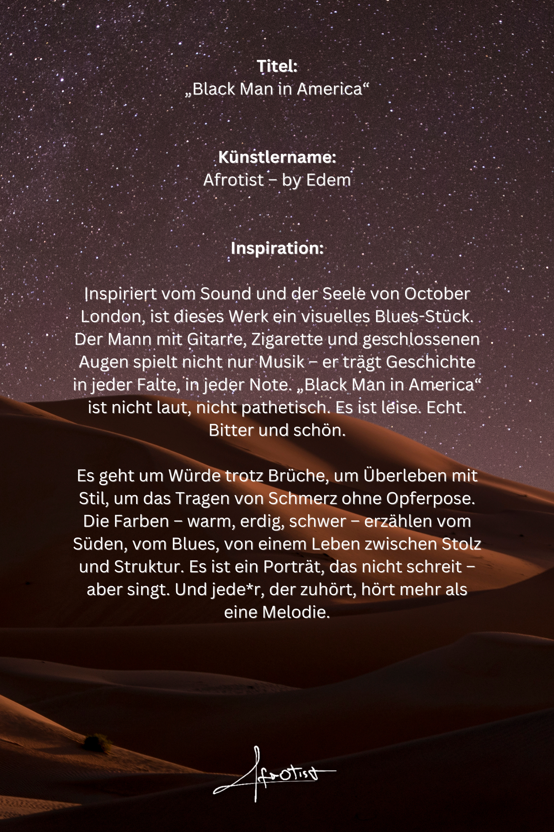„Black Man in America“ von Afrotist – by Edem ist ein tief berührendes Porträt, das die Seele des Blues in visueller Form einfängt. Inspiriert vom Sound von October London, zeigt dieses Werk einen Mann mit Gitarre, Zigarette und geschlossenen Augen – in sich gekehrt, stolz, verletzt und würdevoll zugleich.