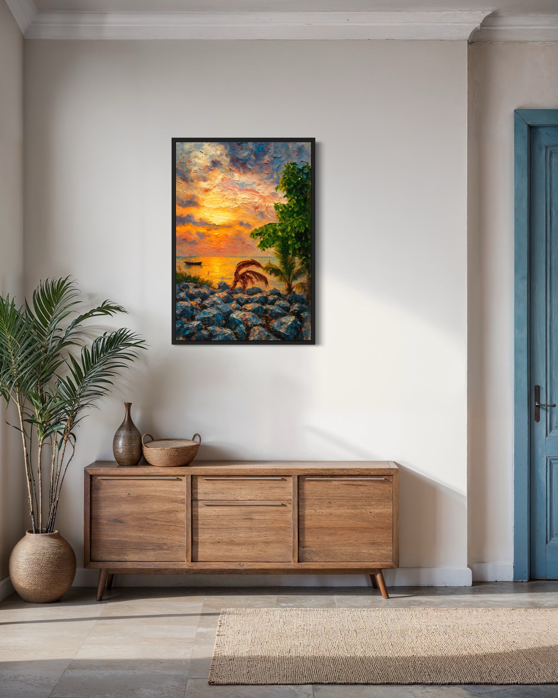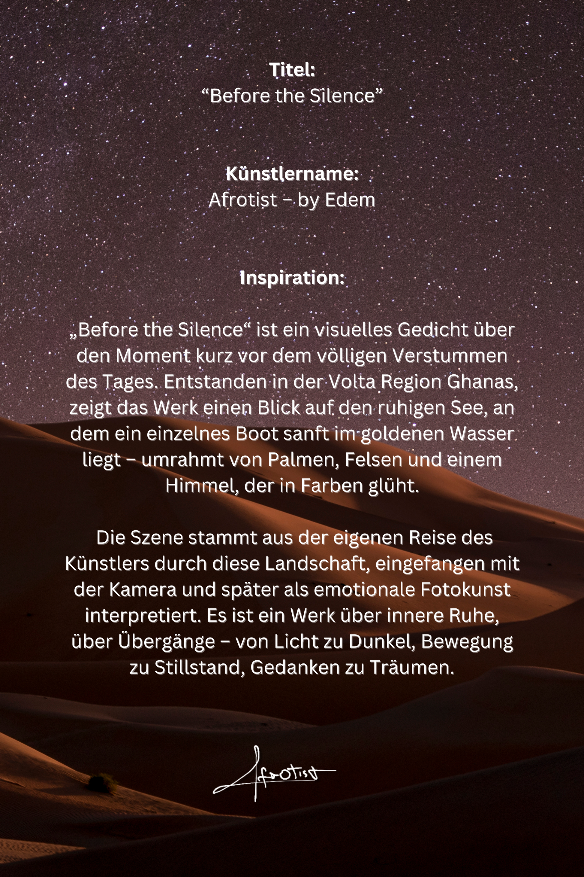„Before the Silence“ ist ein meditativer Fine-Art-Print von Afrotist – by Edem, basierend auf einer eigenen Fotografie am Ufer der Volta Region in Ghana. Die Szene fängt die stille Schönheit des Moments kurz vor der Nacht ein: Ein einzelnes Boot liegt auf goldglänzendem Wasser, während Palmen und Felsen im Vordergrund die Szene umrahmen.