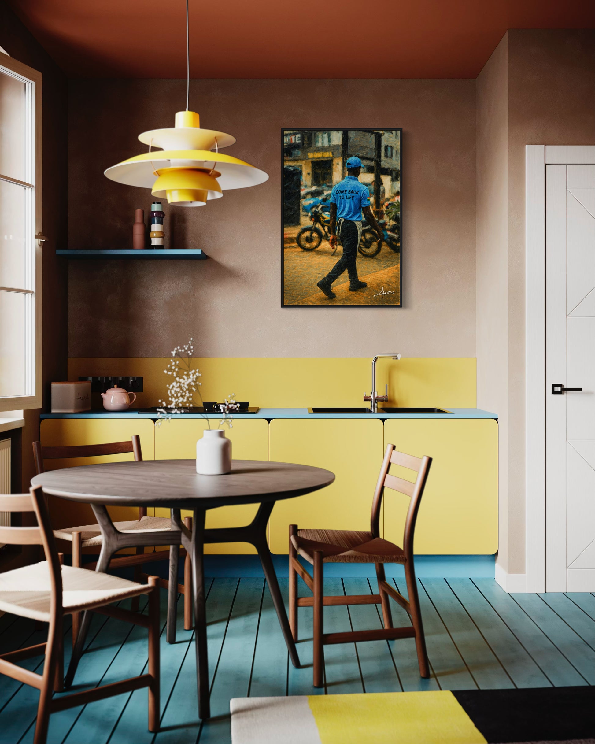 „Come Back to Life“ von Afrotist – by Edem ist ein urbanes Kunstwerk mit starker Botschaft. Es zeigt einen Moment auf einer Straße in Ghana, in dem ein junger Mann mit dem Rücken zur Kamera läuft – auf seinem Shirt der Satz: „COME BACK TO LIFE“.