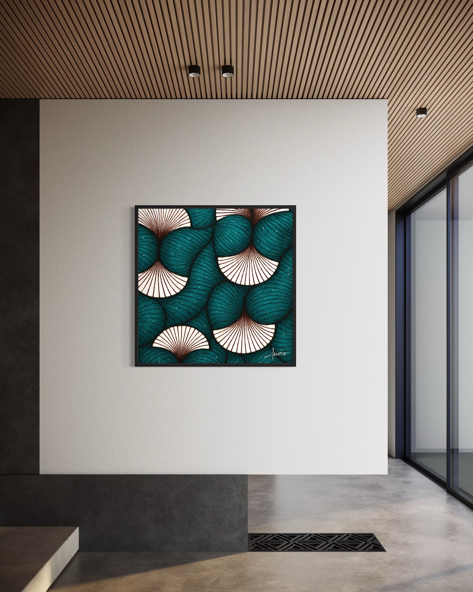 "Tanz der Blätter" von Afrotist - by Edem verbindet die Leichtigkeit der Natur mit afrikanischen Mustertraditionen. Dieses beruhigende Kunstwerk mit organischen Formen und einer harmonischen Farbpalette in Türkis und Creme verleiht jedem Raum eine sanfte, elegante Atmosphäre. Ideal für Wohn-, Schlaf- oder Arbeitsbereiche – für alle, die Naturverbundenheit und kulturelle Tiefe in ihrer Einrichtung spüren möchten. Hol dir ein Stück afrikanischer Kunst und Natur nach Hause!